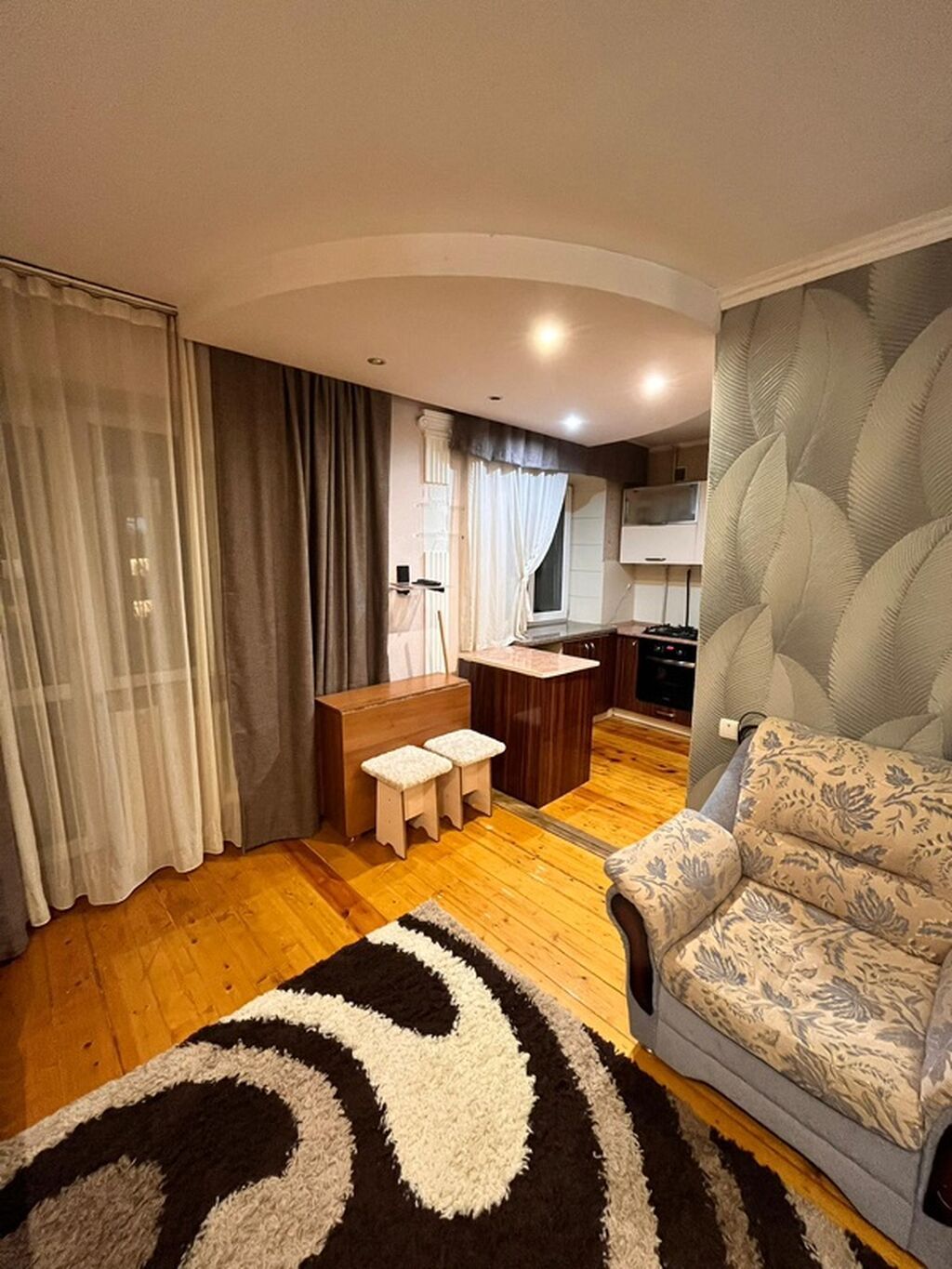 - Гостиная-кухня: зонированное пространство с арочным потолком и точечным освещением. Кухонный гарнитур с верхними и нижними шкафами, варочная панель, духовой шкаф. Барная стойка/остров, обеденная зона со складным столом и табуретами. Большие окна с плотными шторами и тюлем, с выходом на лоджию