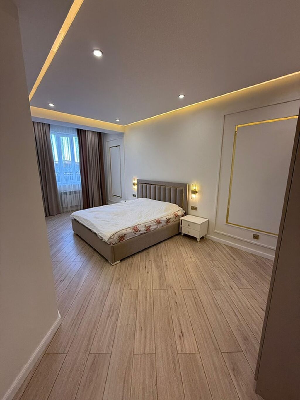 - Просторная спальня с потолочной подсветкой по периметру, точечными светильниками и высокими...