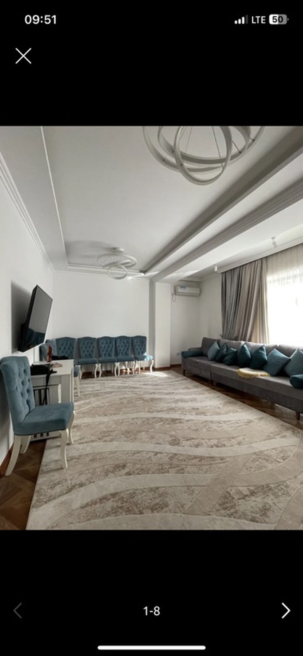 - Большая гостиная с длинным диваном, набором мягких стульев, настенным ТВ, декоративной стеной с 3D-эффектом, круговыми потолочными светильниками и...