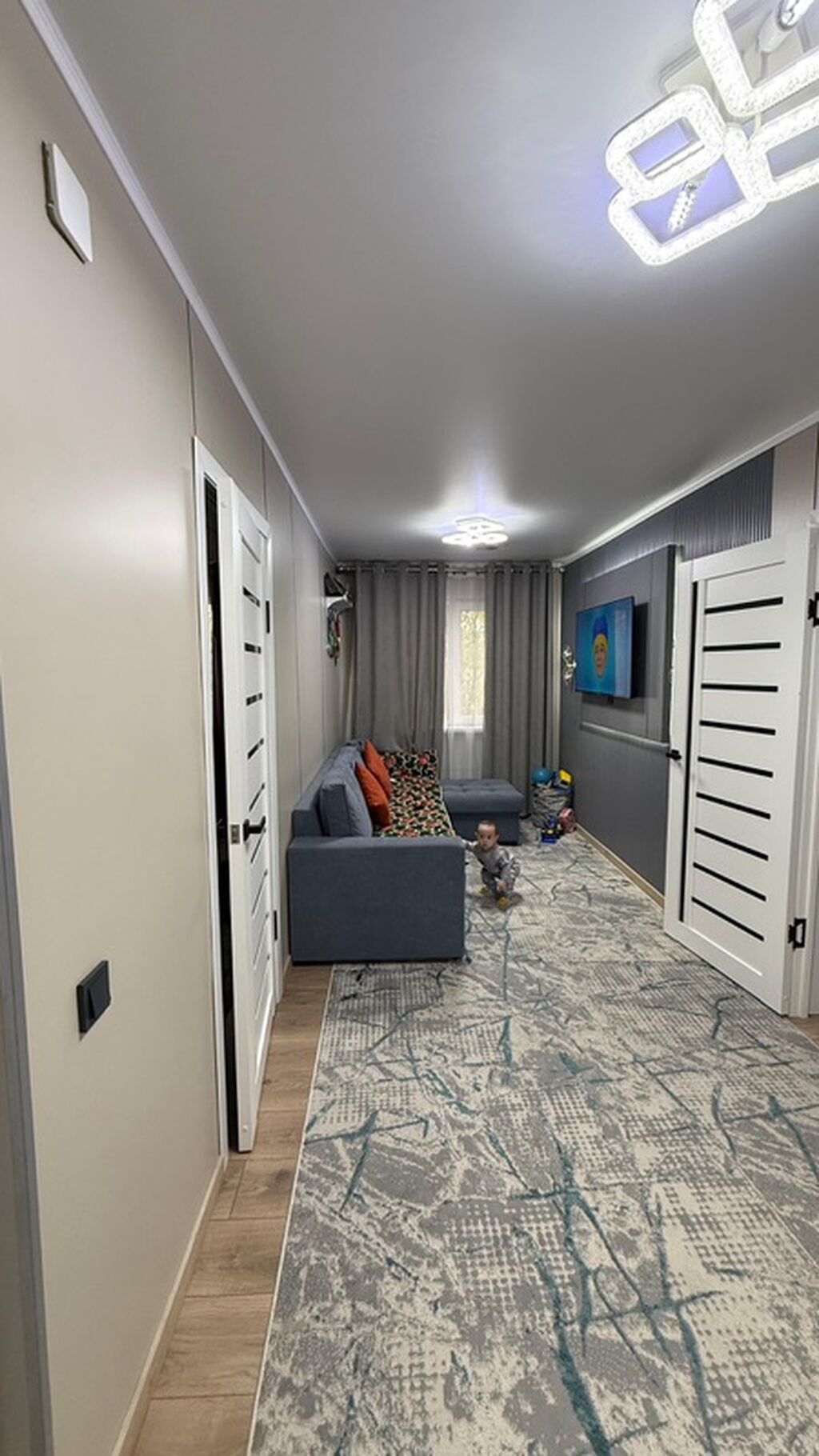- Планировка: гостиная с ТВ-зоной и большим угловым диваном, отдельная комната (может использоваться как спальня/кабинет/детская), коридор, санузел и кухня-ниша (по плану квартиры).