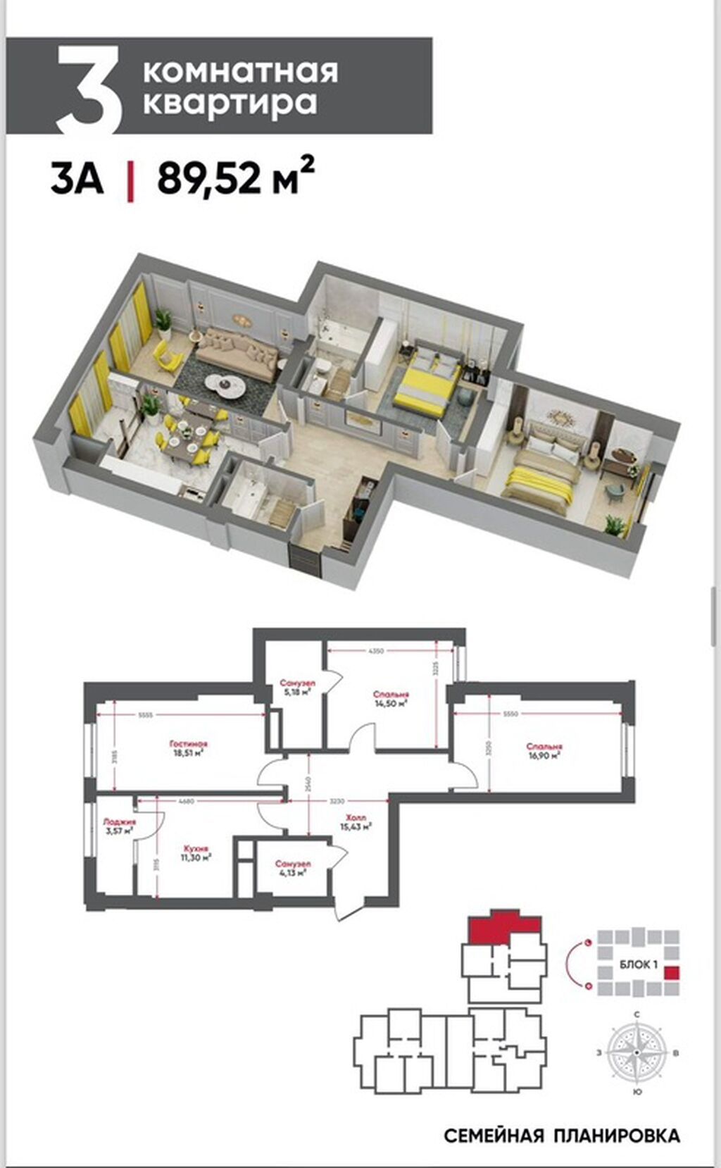 3 комнаты, 90 м², Элитка, 4 этаж, Готовая ПСО (под самоотделку)