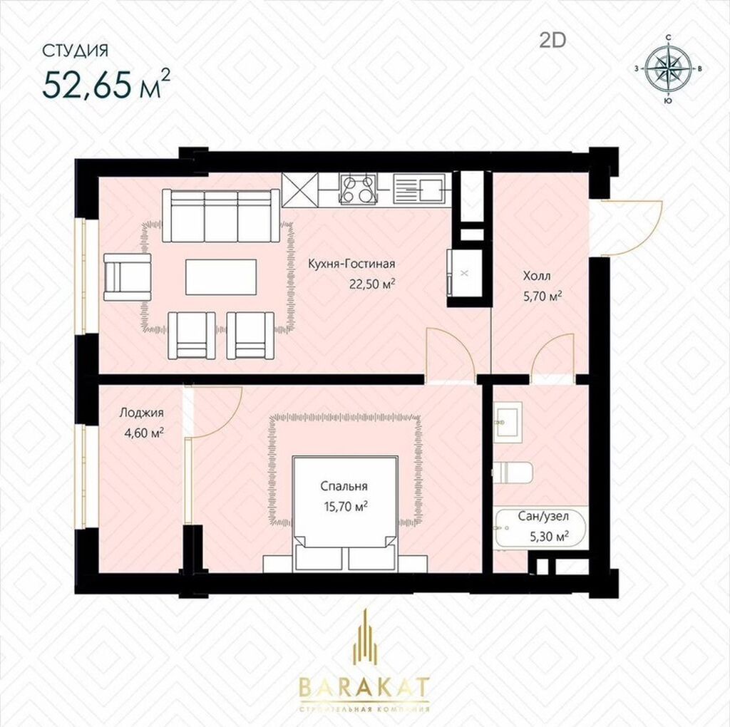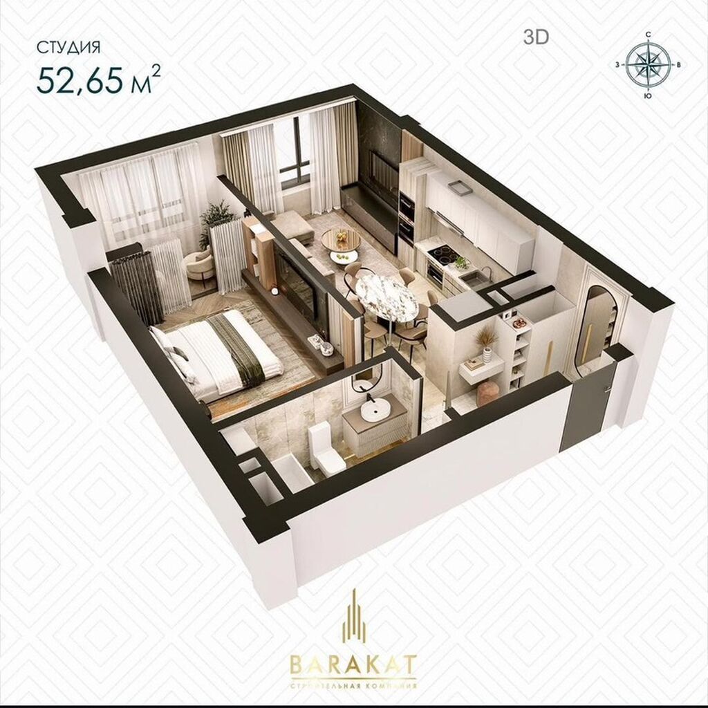 - Кухня-гостиная 22,5 м² с зоной готовки и обеденным столом