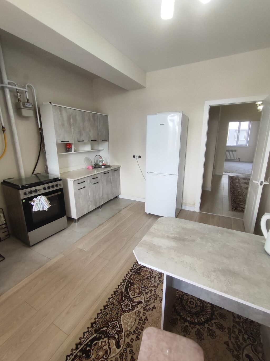 - Просторная кухня с выходом на балкон/лоджию. Установлены газовая плита с духовкой, кухонный гарнитур, вытяжка, холодильник, обеденный стол со стульями. Газовый...