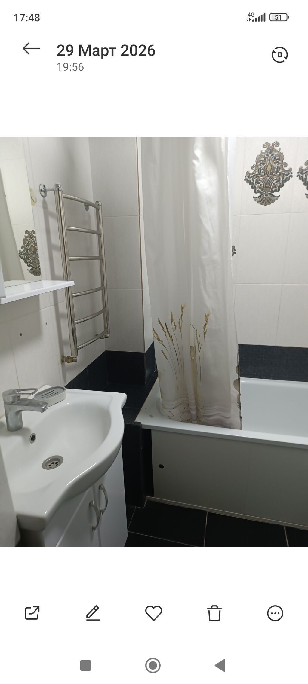 - Санузел совмещенный: ванна стандартная с экраном, шторка, умывальник с тумбой и смесителем, зеркало‑полочка, полотенцесушитель из нержавеющей стали, керамическая плитка на стенах и полу, принт‑вставки.