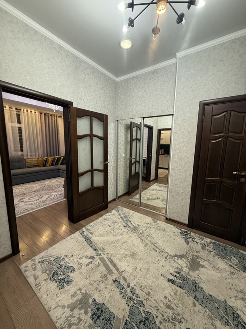 - Просторный коридор с большим зеркальным шкафом‑купе, современными потолочными светильниками и декоративной отделкой под белый кирпич.