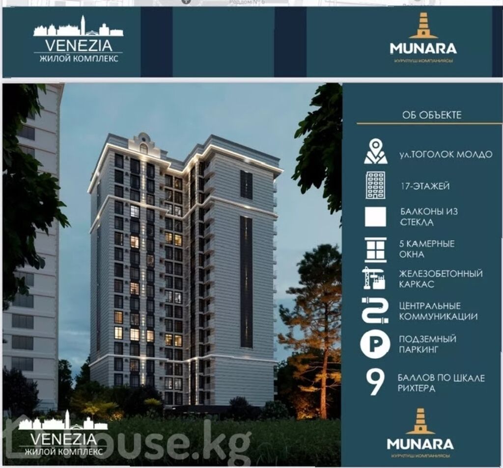 Продается 1ком.квартира🔥СК Мунара СТРОЙ 🔥 .ЖК ВЕНЕЦИЯ 🔥 Золотой квадрат 🔥 Токтогула/Тоголок Молдо.Все коммуникации центральные, отопление центральное 🔥Площадь 44кв.м этаж15/17 ,сдача под псо конец 2026 года , первый блок построен сдан...