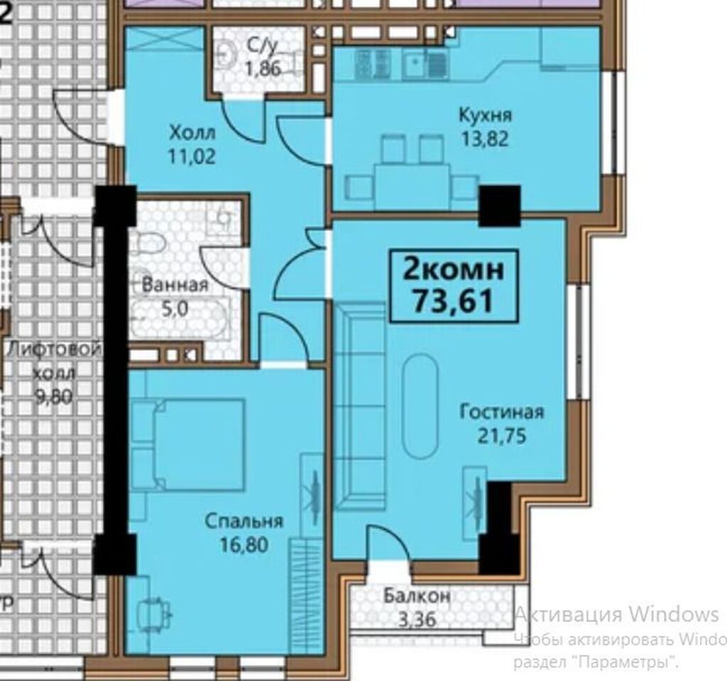 2 комн.1 санузл.74 м²11/14 эт.