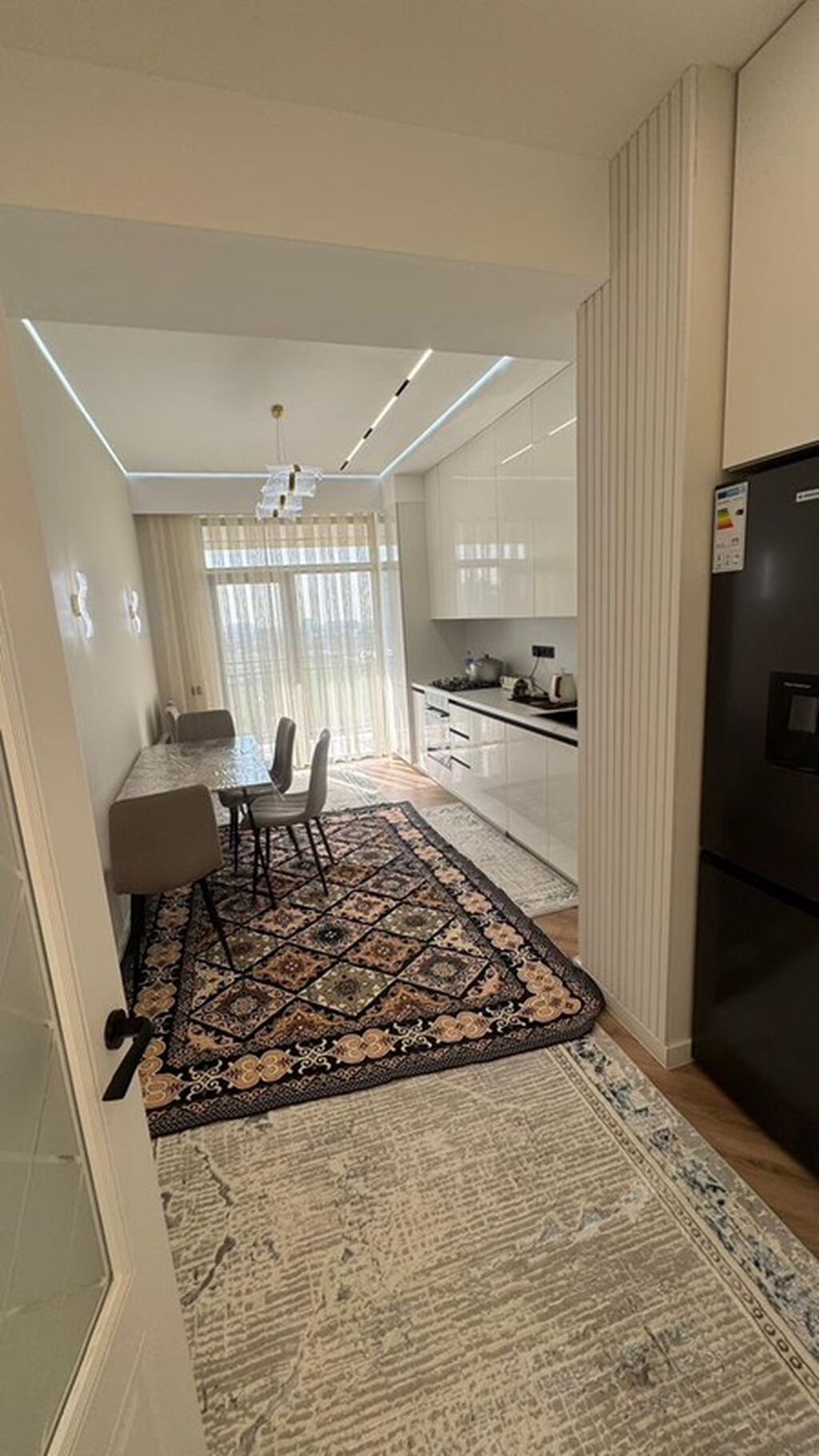 - Отдельная кухня‑столовая: глянцевый белый гарнитур в стойке,...