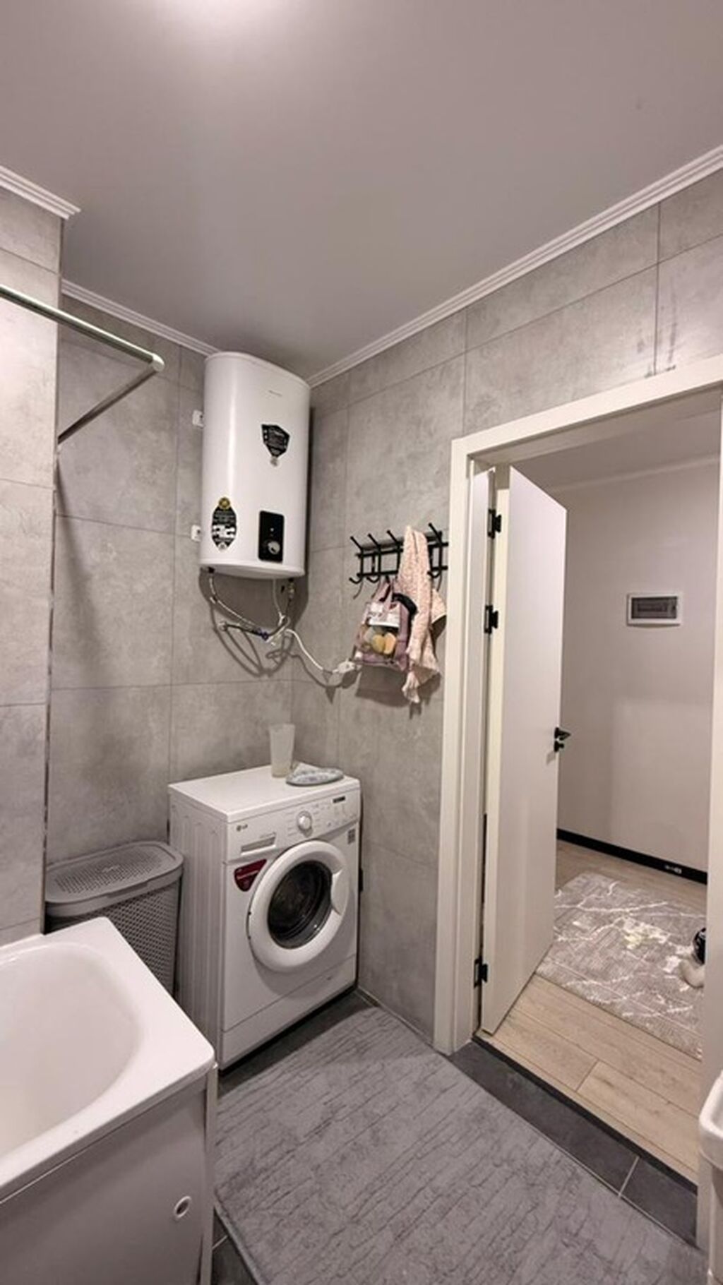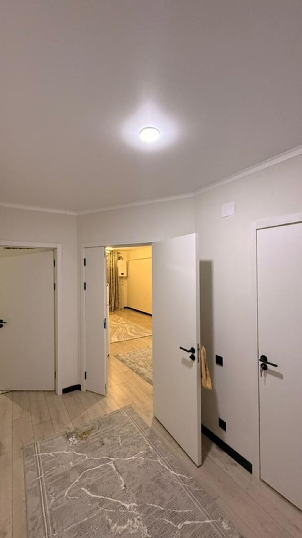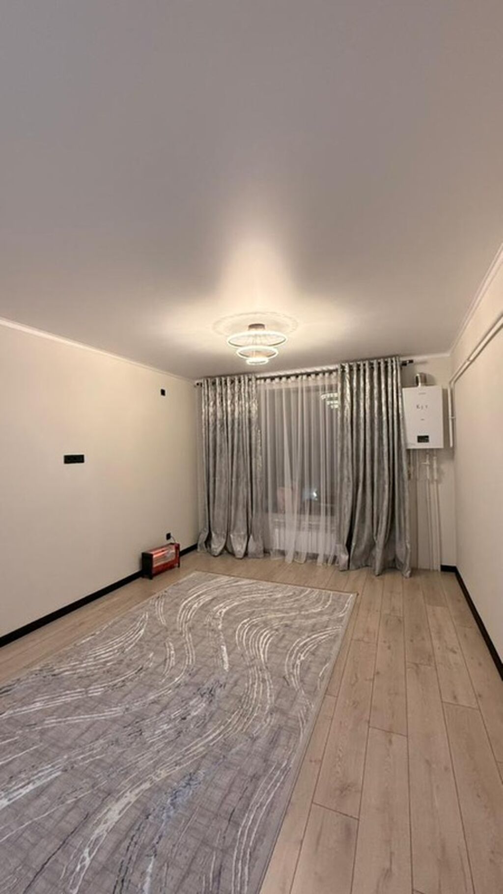 - Просторная комната с большим окном, плотными портьерами и тюлем, потолочный светильник, светлый ламинат, настенный газовый котёл для автономного отопления и горячей воды.