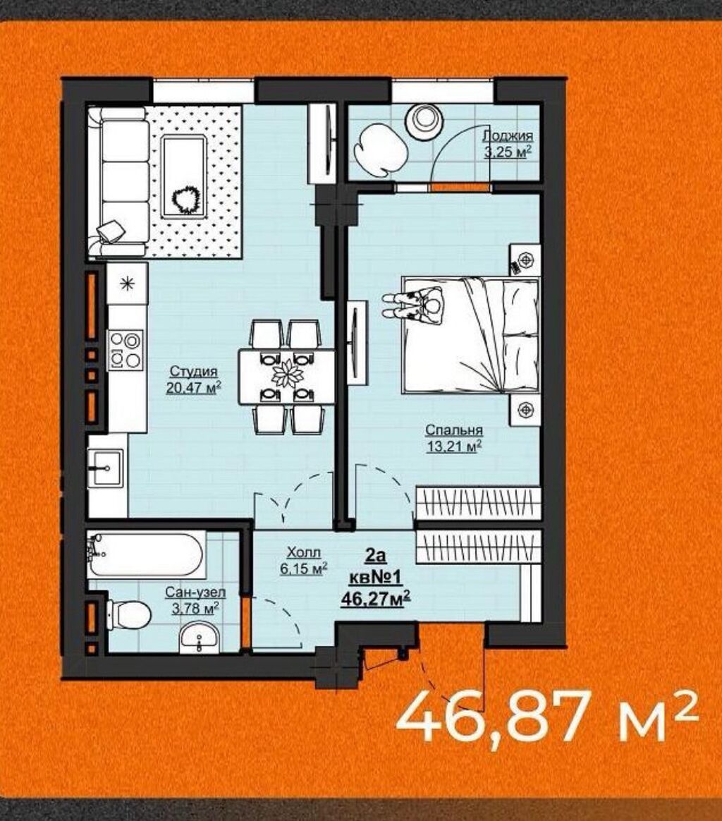 1 комн кв 46.87 кВ.м.