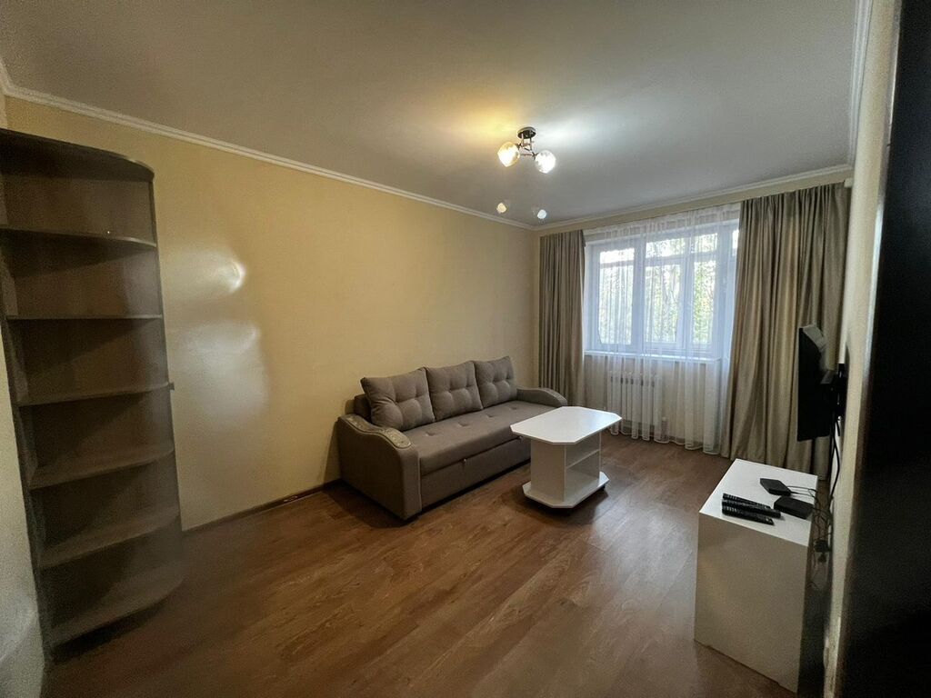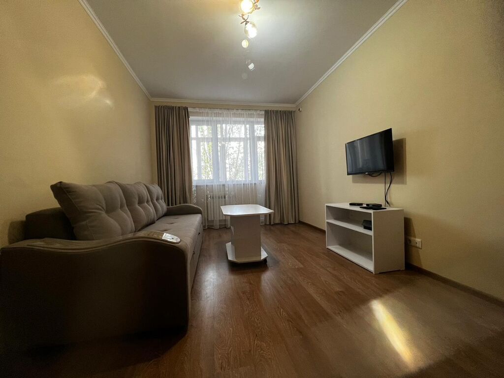 - Просторная гостиная с большим окном, раскладным диваном, журнальным столиком, тумбой под ТВ и настенным телевизором.