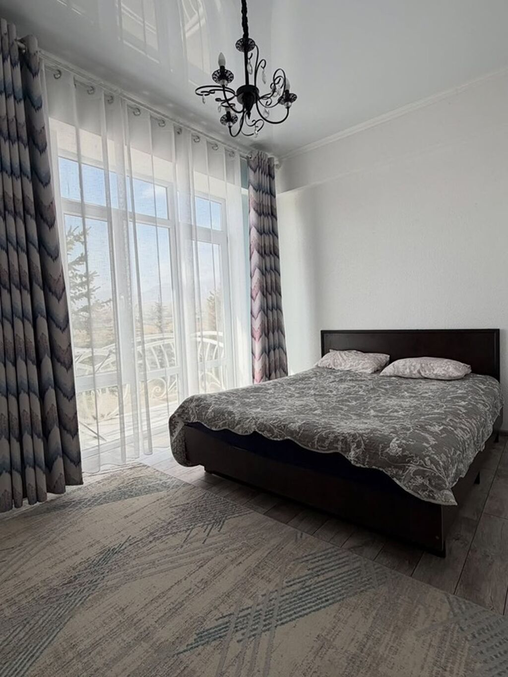 - Отдельная спальня с двуспальной кроватью и выходом на балкон/лоджию через панорамные...