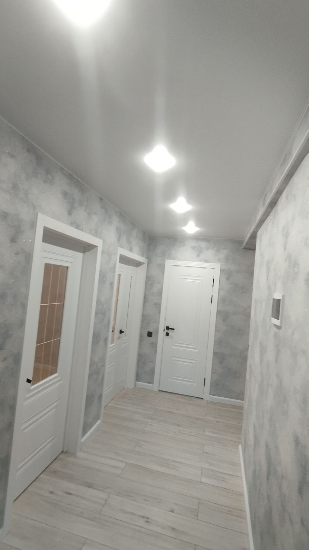 - Просторный коридор с точечным освещением, белые межкомнатные двери.
