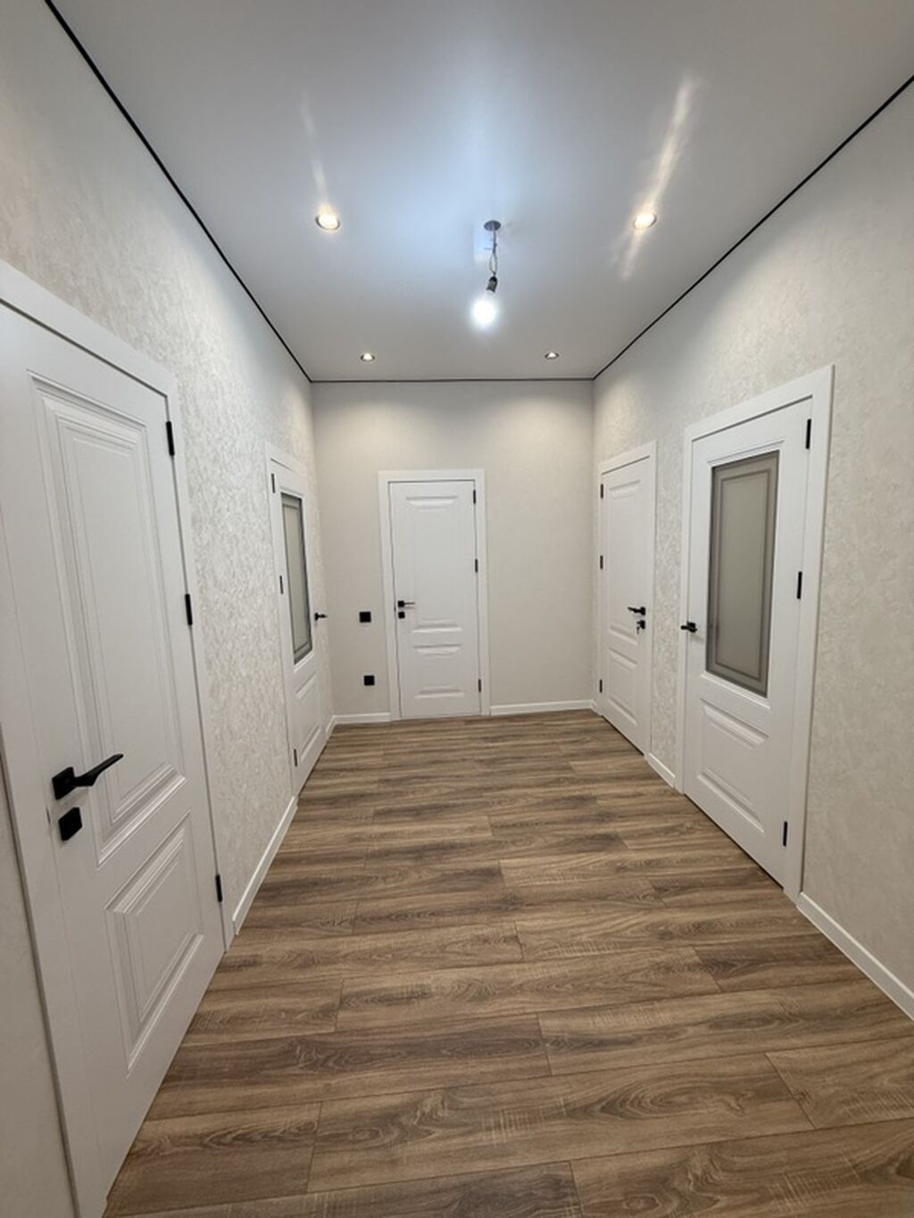 - Отделка: стены — декоративная штукатурка в пастельных оттенках; потолки — натяжные с контурным примыканием и встраиваемыми точечными светильниками; на полу — износостойкое покрытие под натуральное дерево с единым контуром по всей квартире; массивные белые филенчатые двери с матовыми вставками и черной фурнитурой.