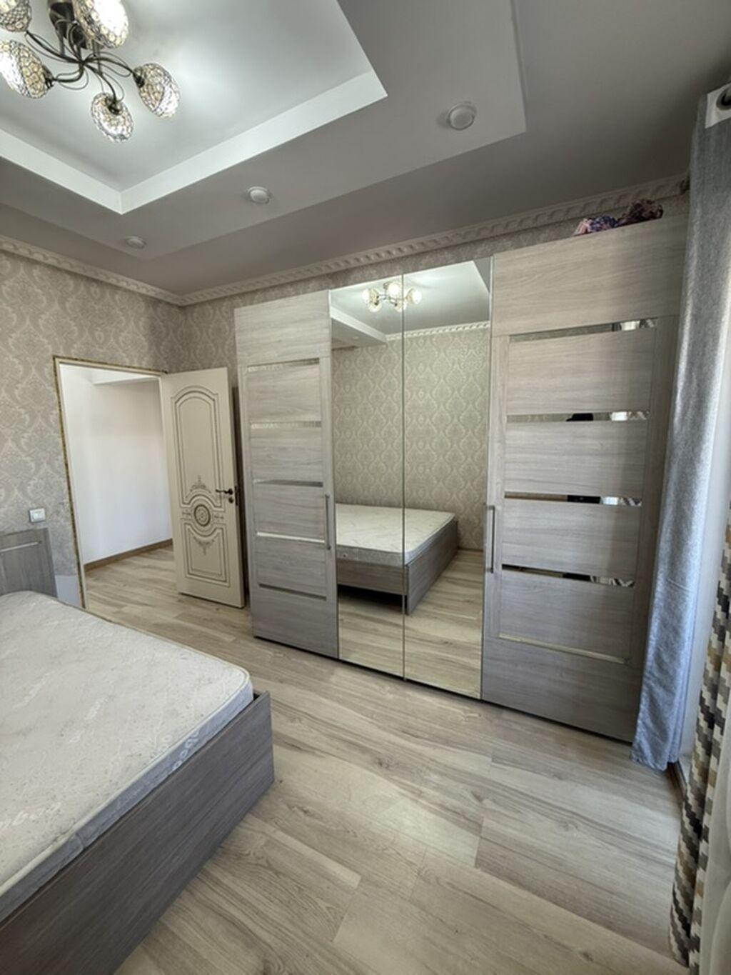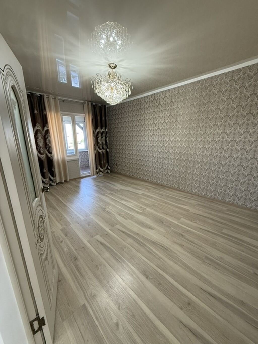 - Просторная комната с выходом на застеклённый балкон/лоджию, декоративные обои, два хрустальных потолочных светильника, натяжной глянцевый потолок.