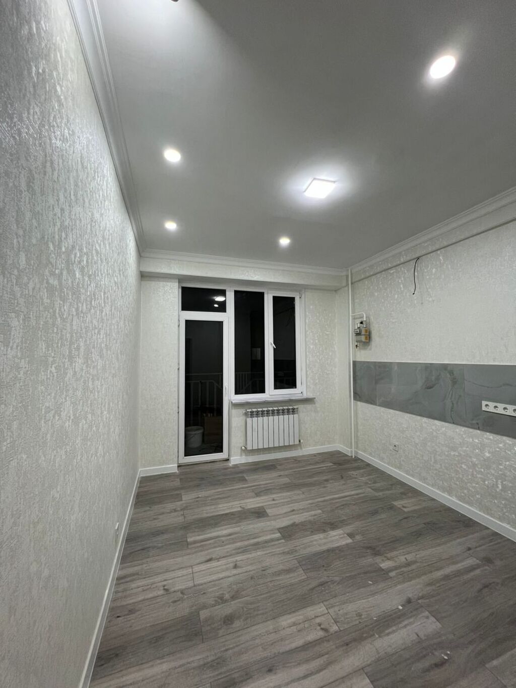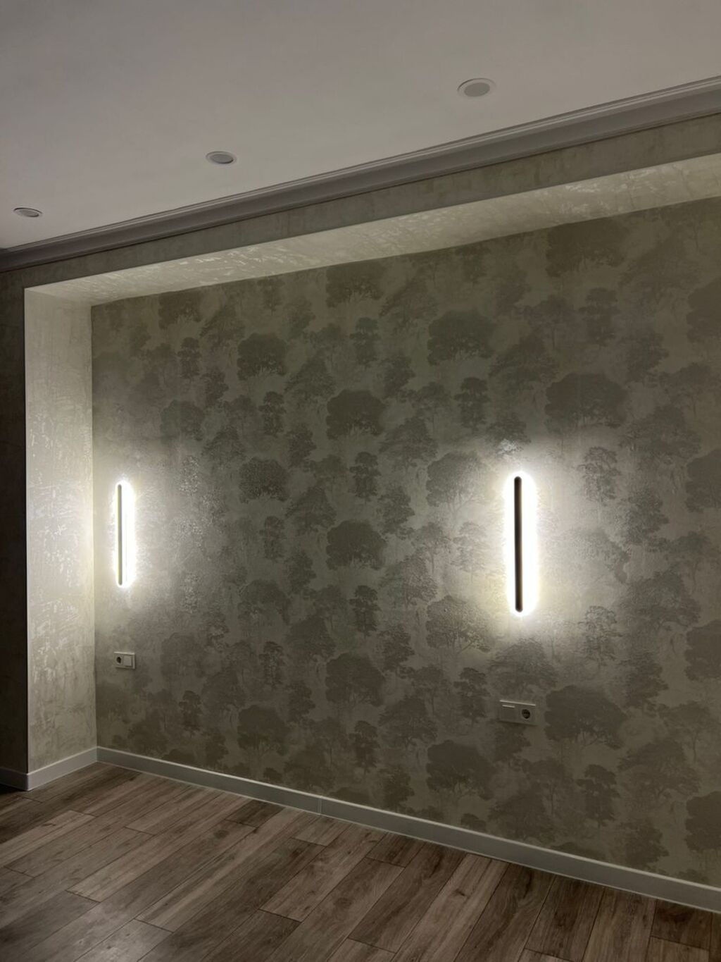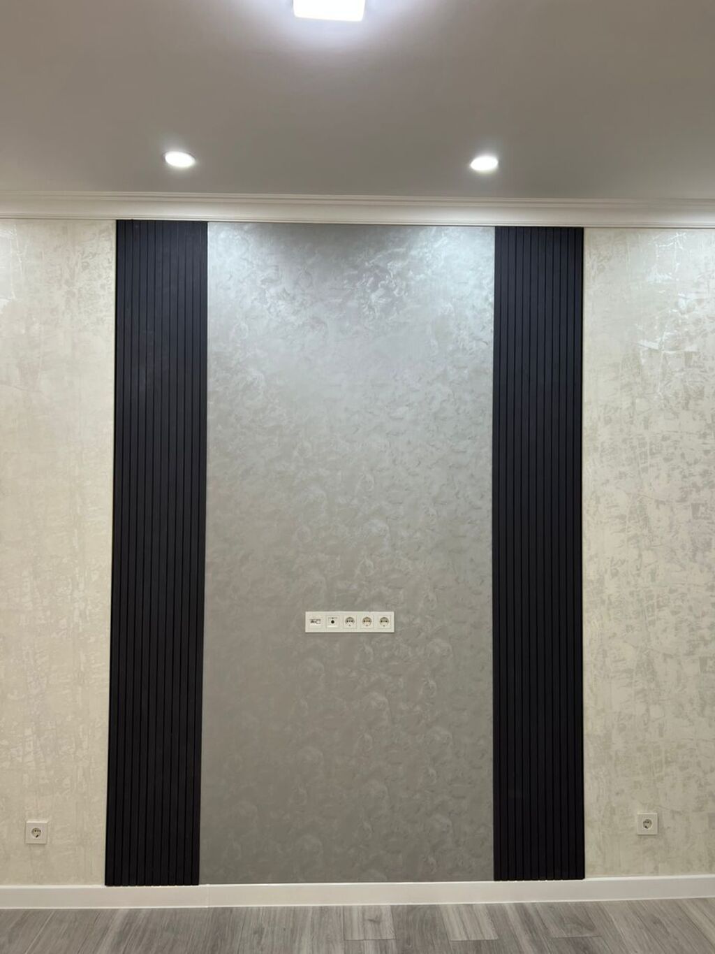 - Изолированная комната с акцентной ТВ-зоной: декоративная стена в серых тонах с вертикальными черными рейками, группа розеток и выводы под ТВ/интернет.