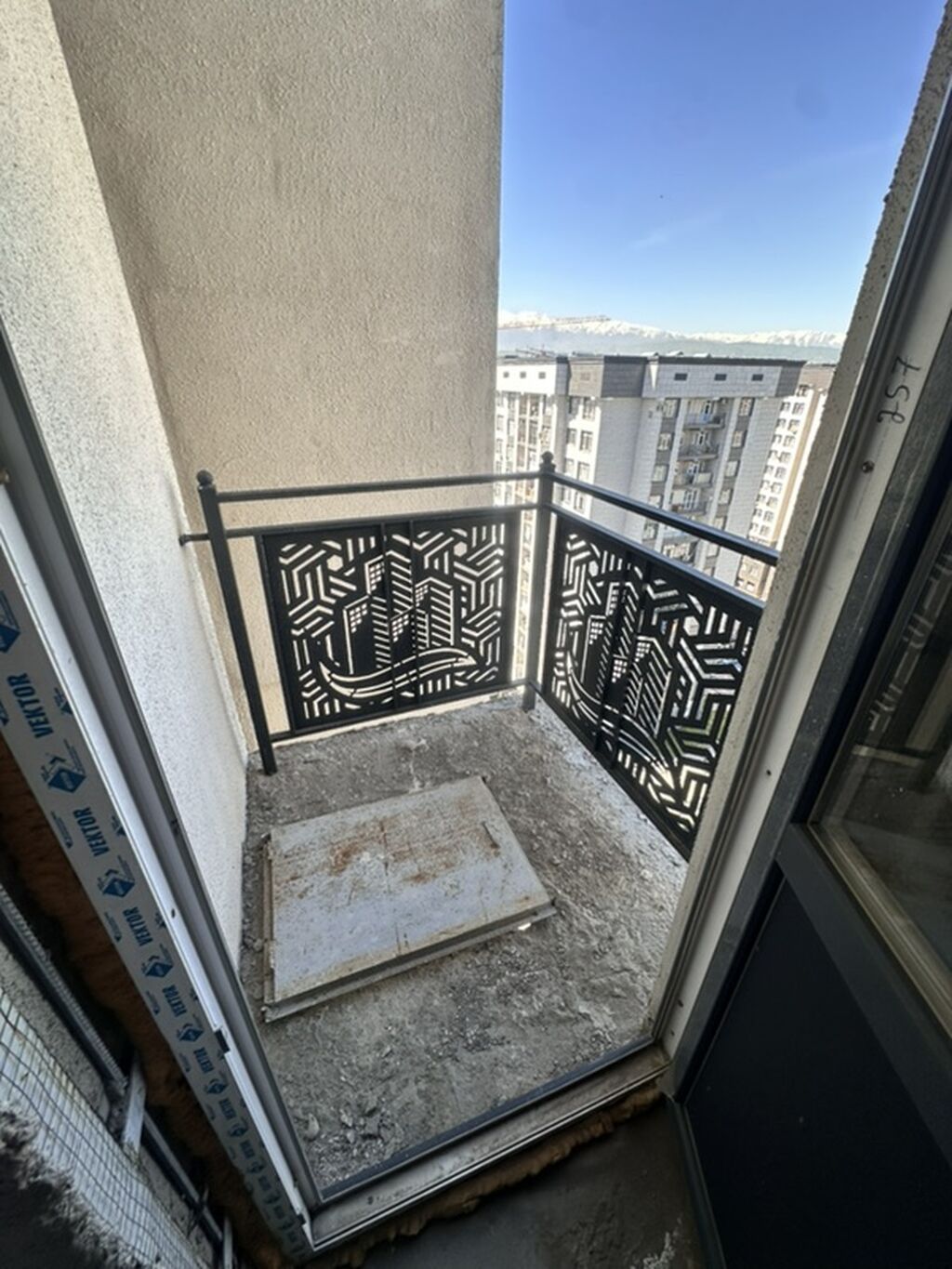 Квартира в современном доме башенного типа с коммерческими помещениями на первом этаже. Высокий этаж, панорамный вид на город и горы с небольшого балкона с декоративным металлическим ограждением.