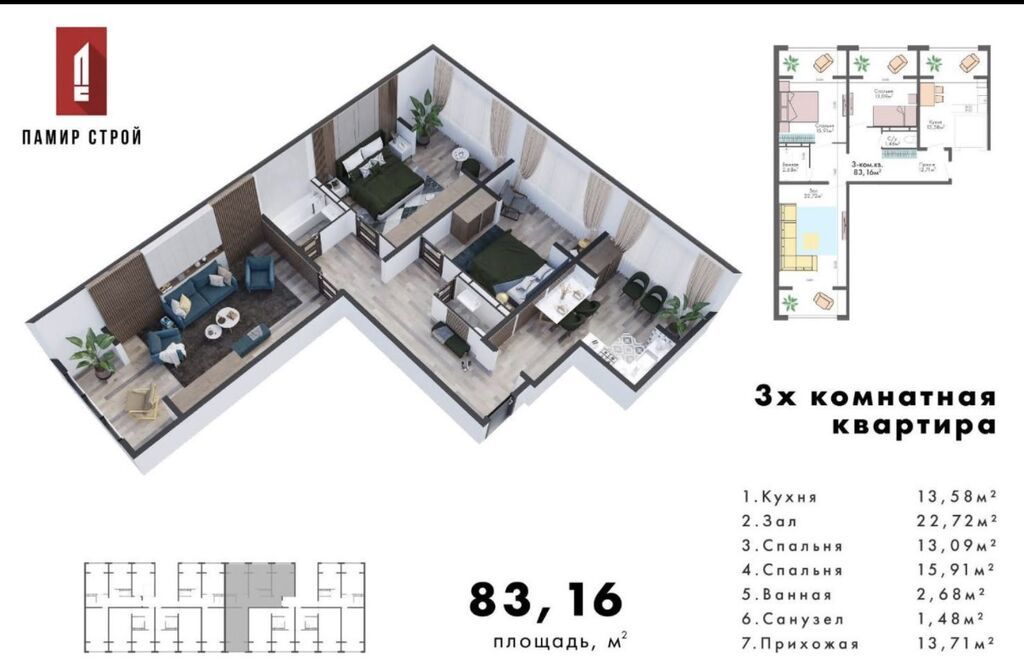 3-комнатная квартира в жилом комплексе Элдик от застройщика «Памир Строй». Общая площадь — 83,16 м². 5-й этаж. Планировка Г-образная, с продуманным зонированием