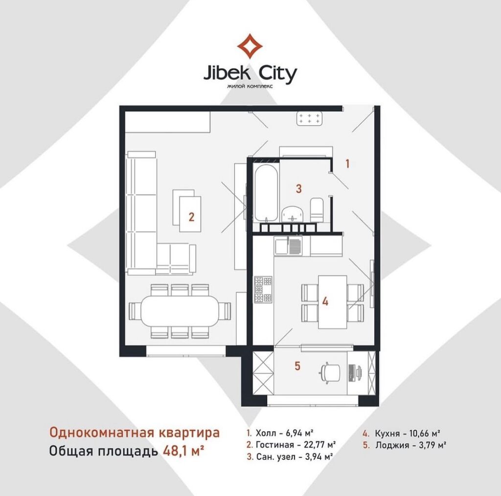 Предлагается однокомнатная квартира общей площадью 48,1 м² в современном комплексе: