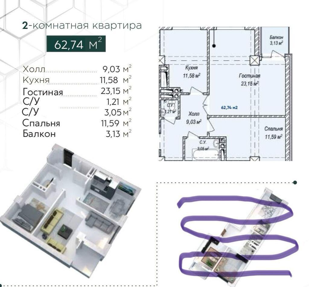🌟 Продается 1-комнатная квартира 🏢 площадью 62,74 м² на 6 этаже в ЖК "Медина"