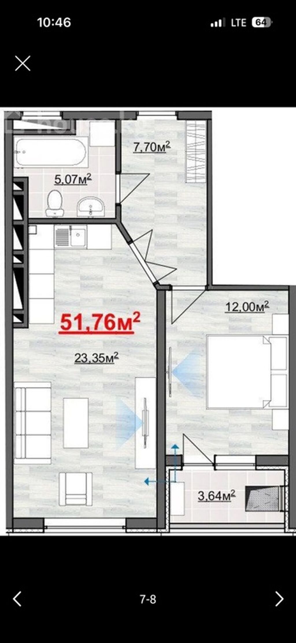 - Общая площадь: 51,76 м²