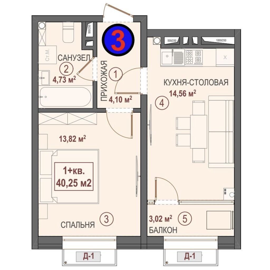 — Площадь: 40,25 м²