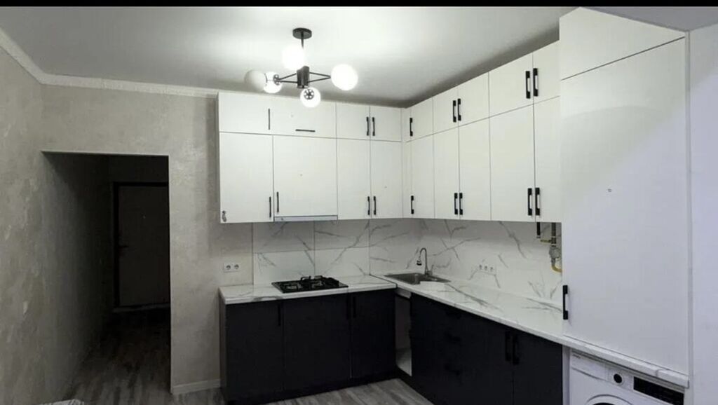 - Фартук и столешница в едином каменном стиле; интегрированная мойка, место под посудомоечную машину, стиральная машина установлена под столешницей.