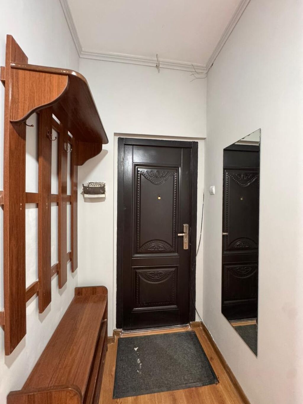 - Просторная прихожая с зеркалом и настенной вешалкой с полкой, тумбой-сиденьем.