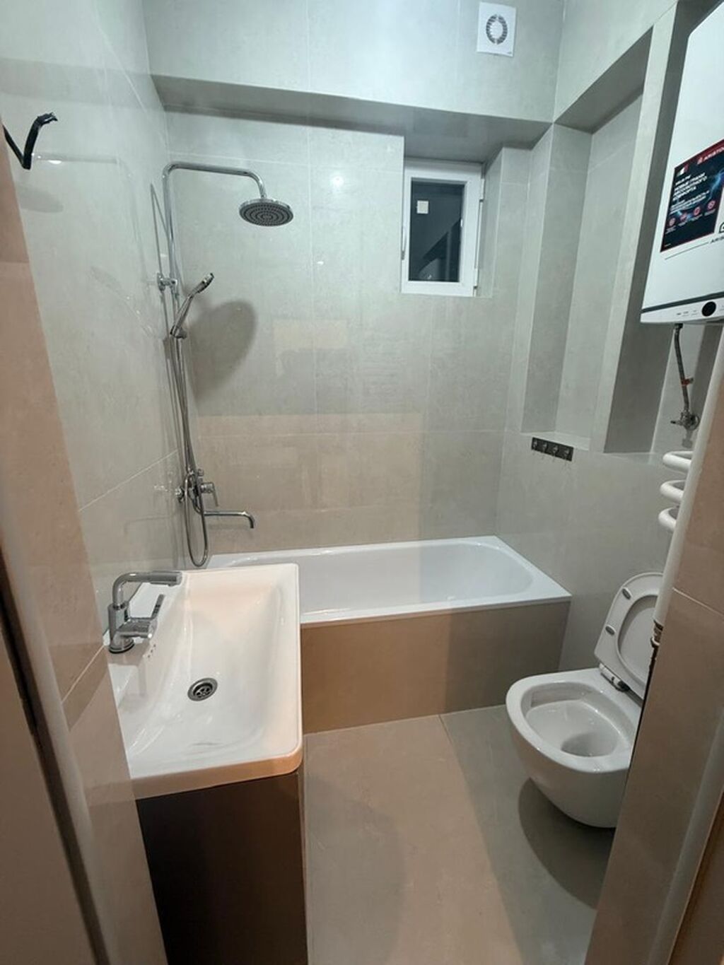 - Санузел совмещённый: ванна стандартной длины, верхний тропический душ и ручная лейка, унитаз, умывальник с тумбой, полотенцесушитель, вытяжка, окно для естественного проветривания.