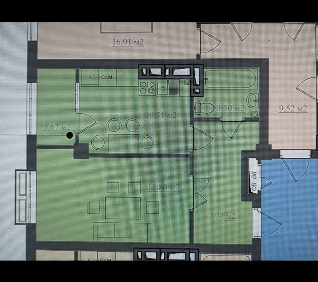- Жилая комната: 15,80 м². Формат позволяет организовать зону отдыха с диваном, ТВ‑тумбой и рабочим местом или разместить полноценную спальню.