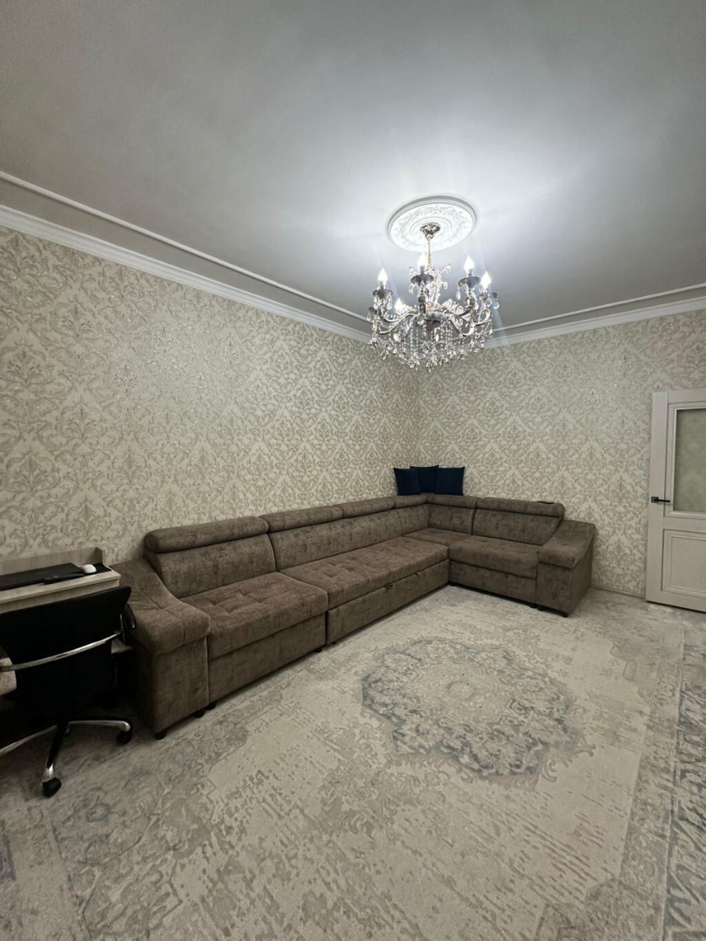- Уютная гостиная с большим угловым диваном, классические люстры, качественные обои, натяжные потолки, аккуратные межкомнатные двери.