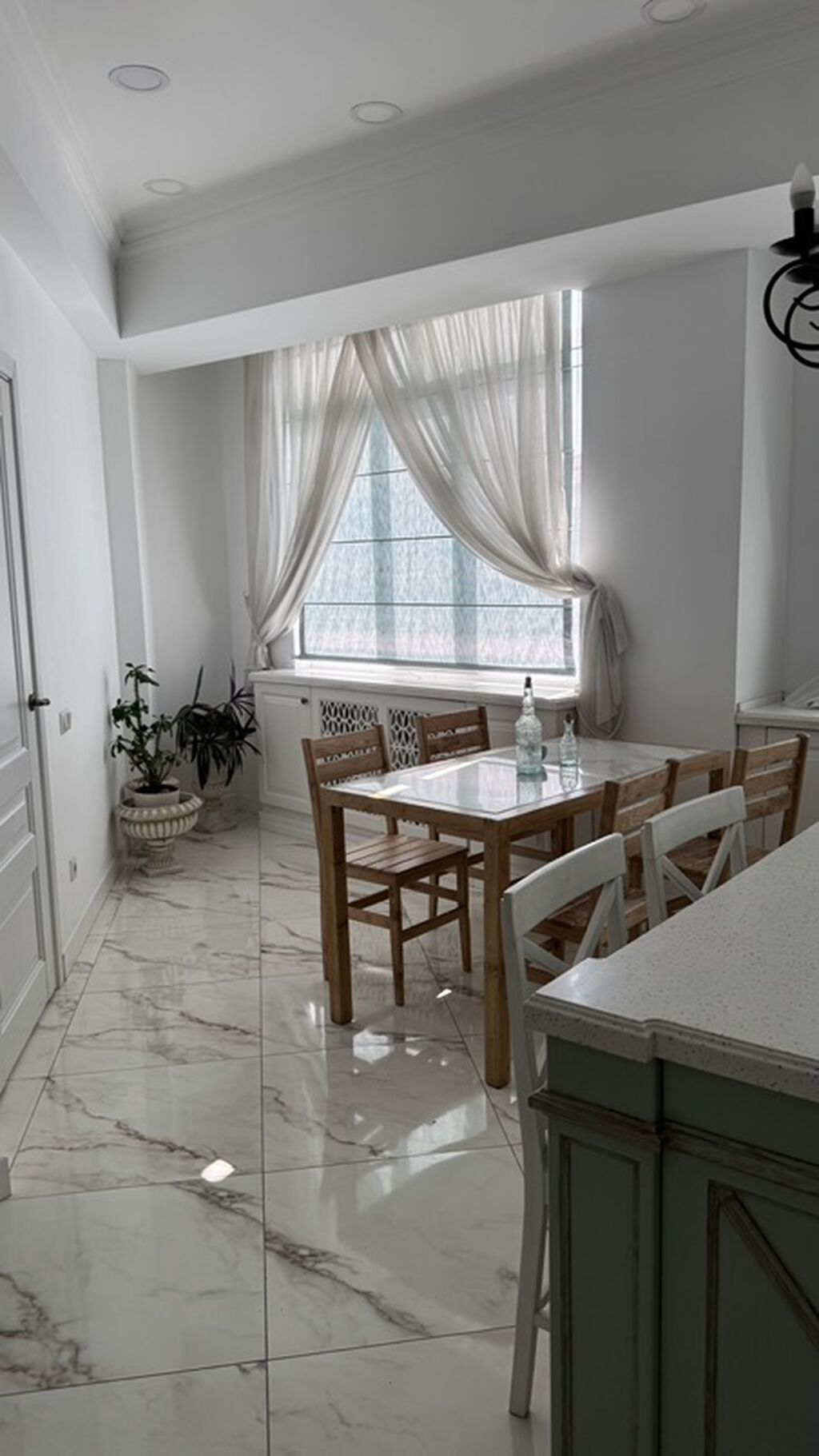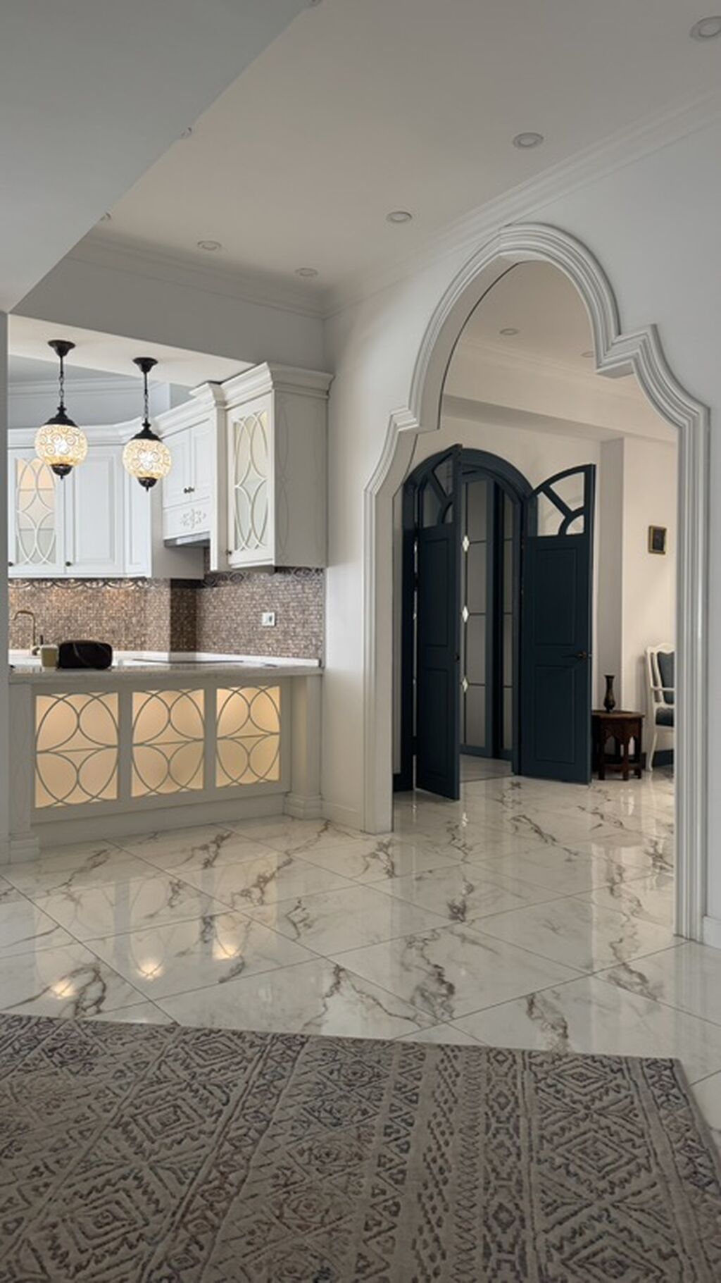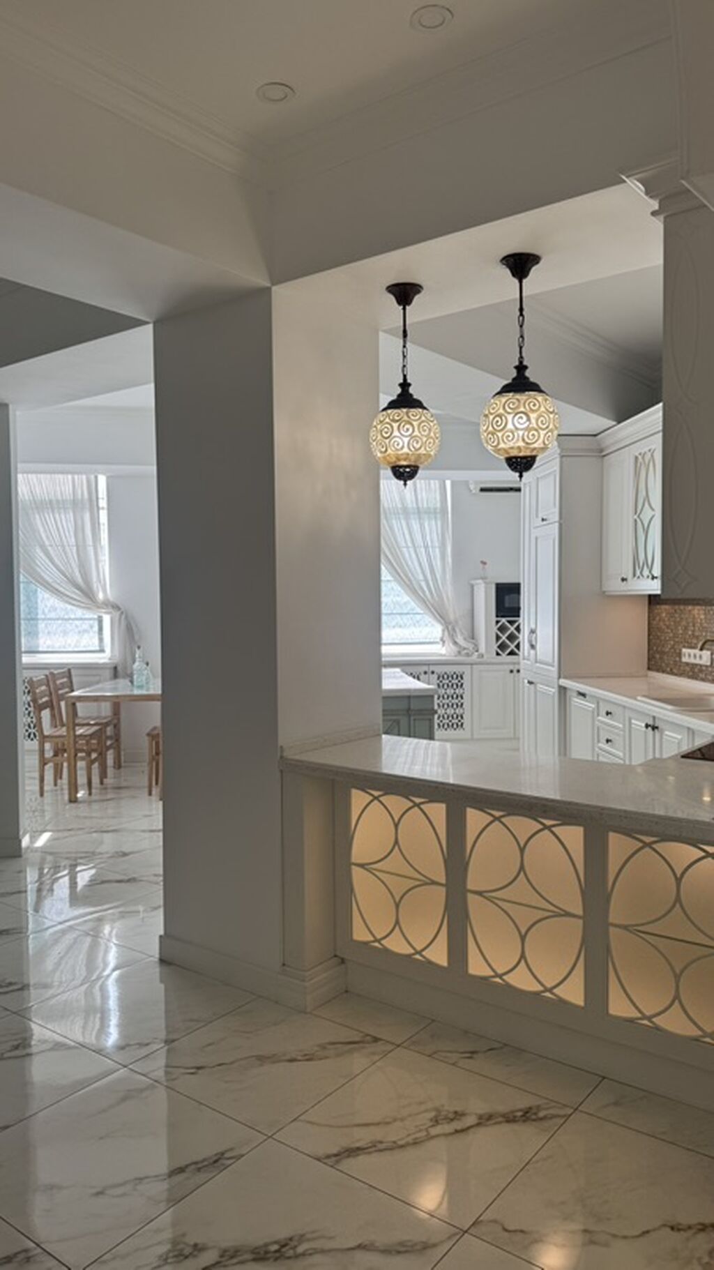- Планировка с широкими проёмами-арками и зонированием: гостиная, столовая зона, кухня с полуостровом/барной стойкой и отдельной рабочей зоной.
