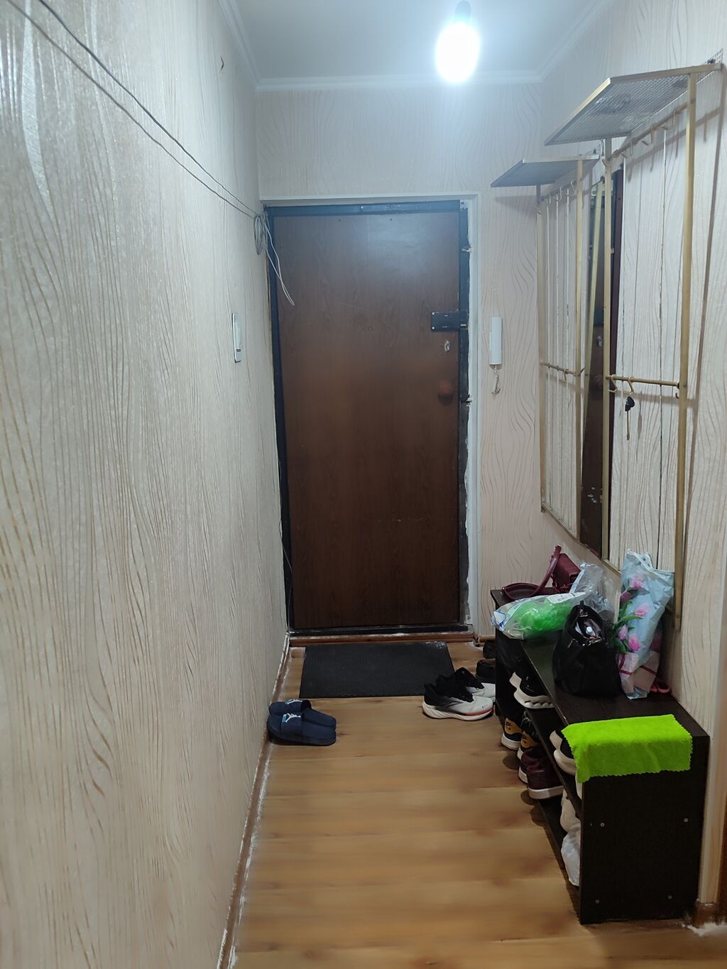 - Прихожая: длинный коридор с зеркалом, полками и металлическими вешалками для верхней одежды, обувница.