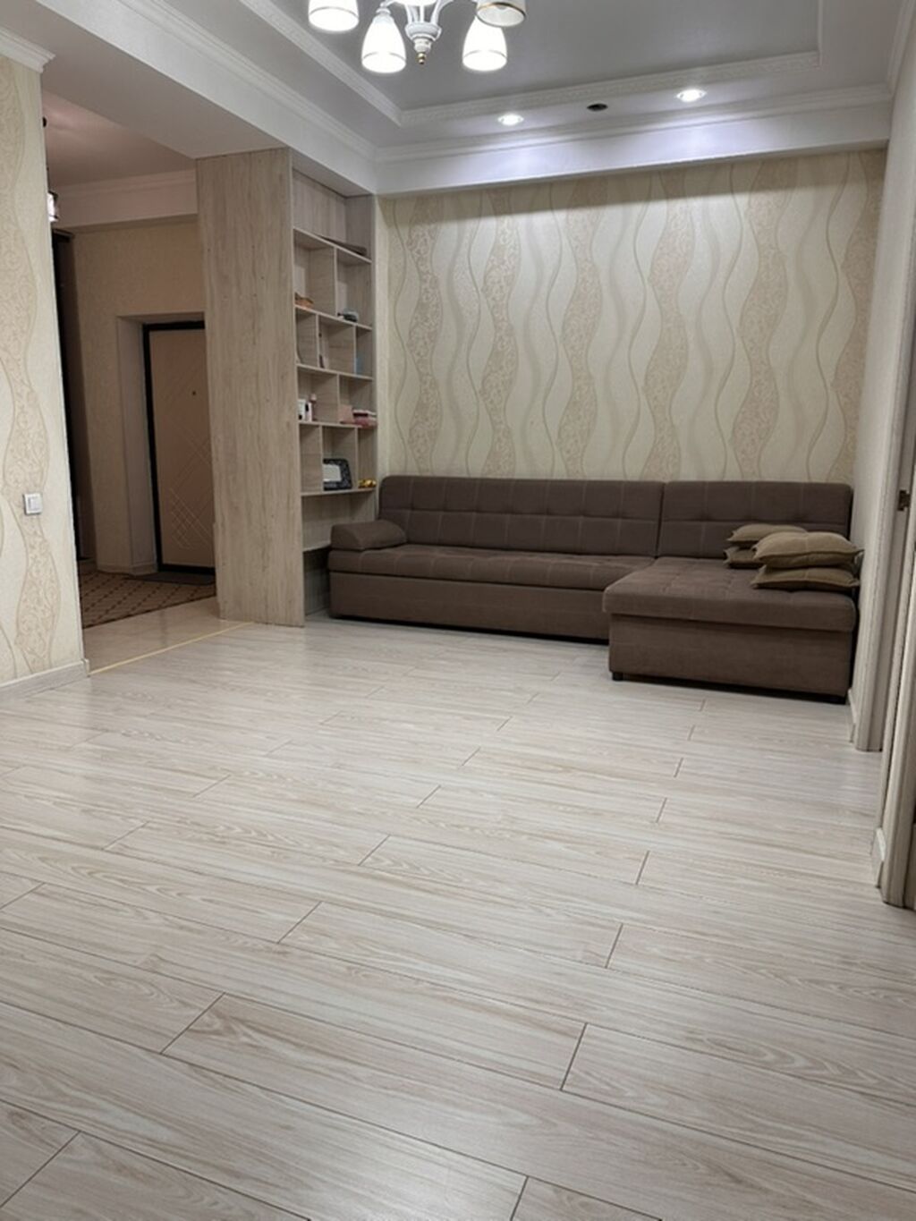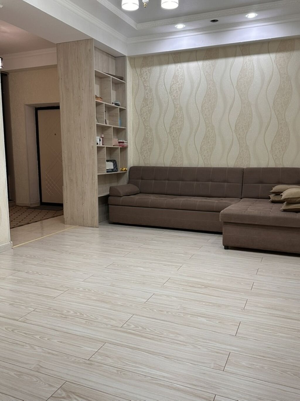 - Просторная гостиная с угловым диваном и встроенным открытым стеллажом; декоративное освещение, акцентная стена с рельефными обоями, высокие...
