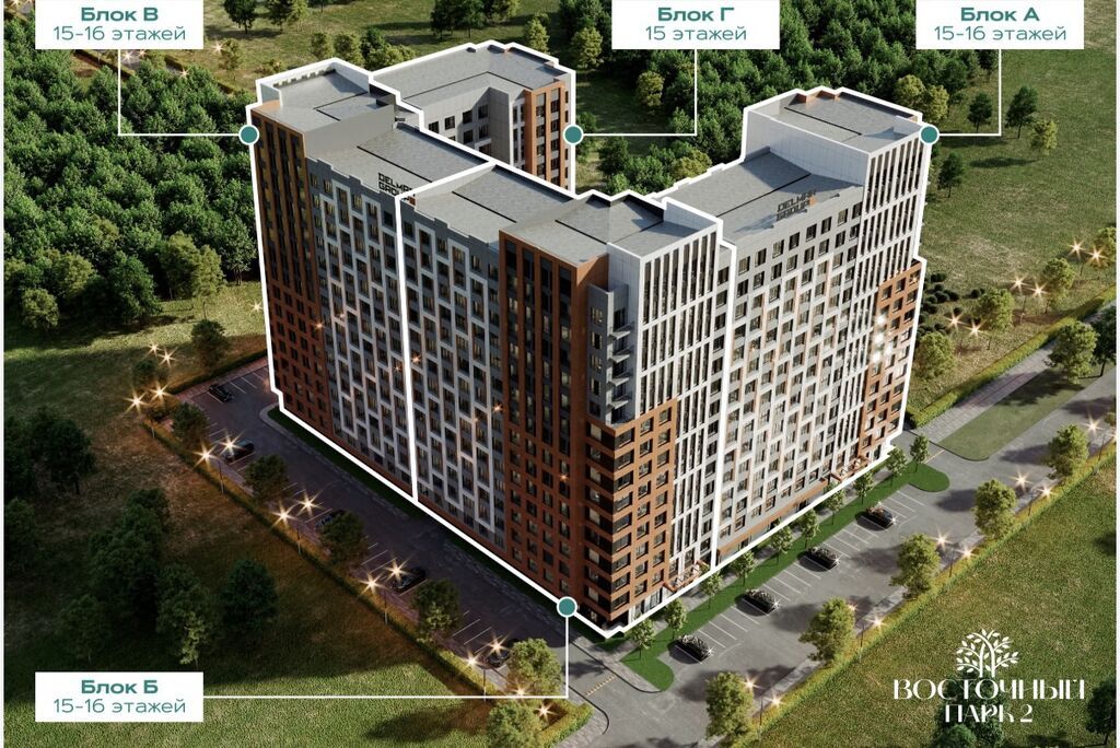 1‑комнатная квартира в ЖК «Восточный Парк 2», блок Б (15–16 этажей). Общая площадь — 44.22 м².
