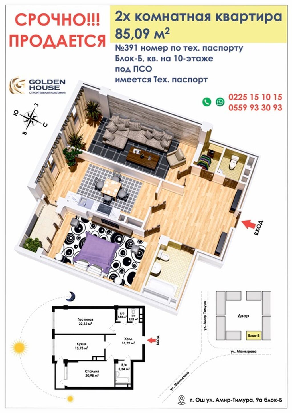 2‑комнатная квартира, 85,09 м², г. Ош, ул. Амир-Тимура, 9а, блок Б. Квартира №391 по техпаспорту, 10‑й этаж, имеется техпаспорт, под ПСО.