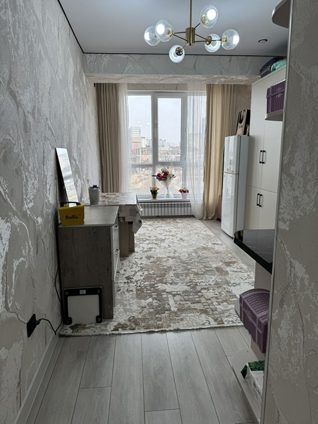 Продается просторная 1-комнатная квартира.Панорамные окна, высокие потолки и много естественного света. Современная отделка в светлых тонах: ламинат под серое дерево, натяжные потолки с точечными светильниками и дизайнерскими люстрами.