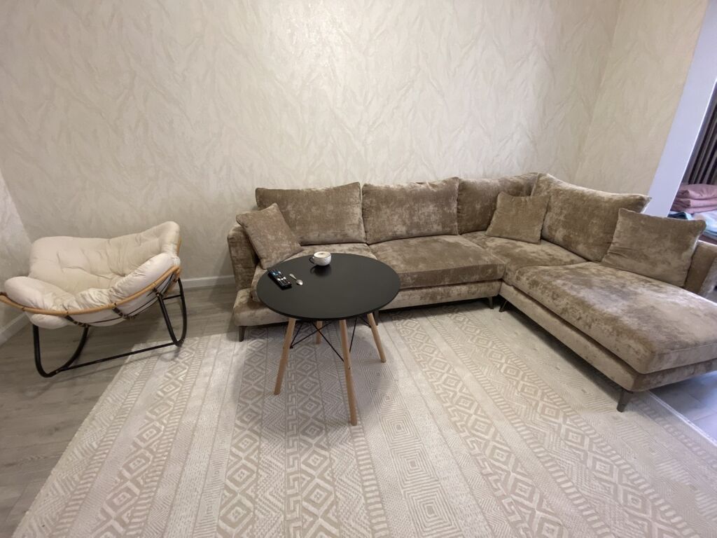 - Гостиная: большой угловой диван в бархатистой обивке, журнальный столик на деревянных ножках, мягкое кресло «кокон». По одной стене — декоративные вертикальные панели в спокойных...