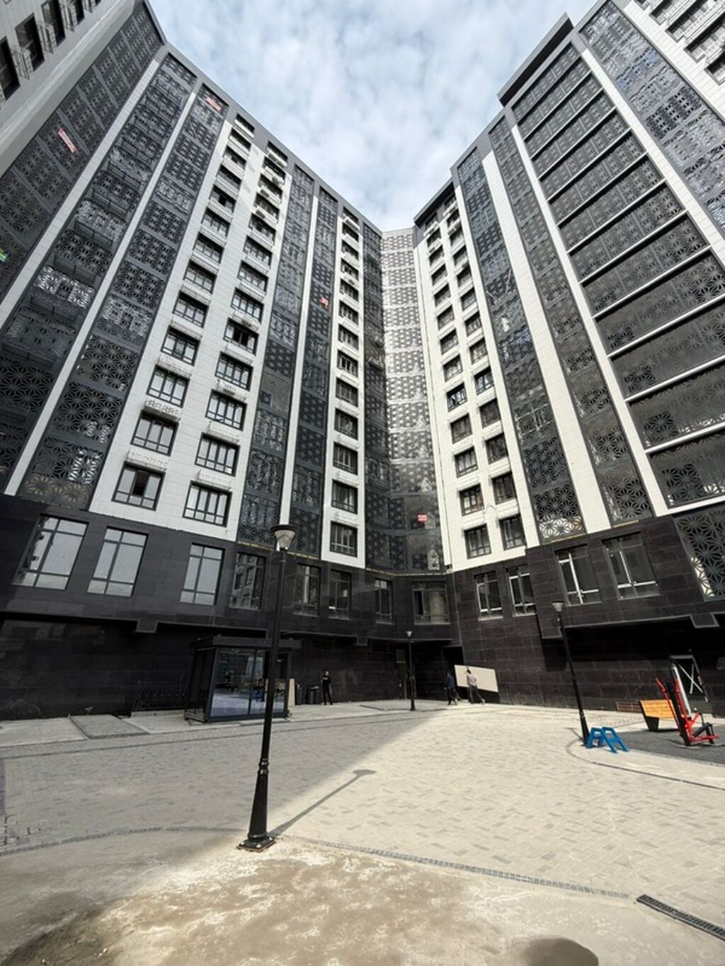 Продаётся квартира в современном жилом комплексе с закрытым двором и архитектурным фасадом с декоративными панелями. Внутренний двор мощёный, есть уличное освещение, скамейки и детские элементы.
