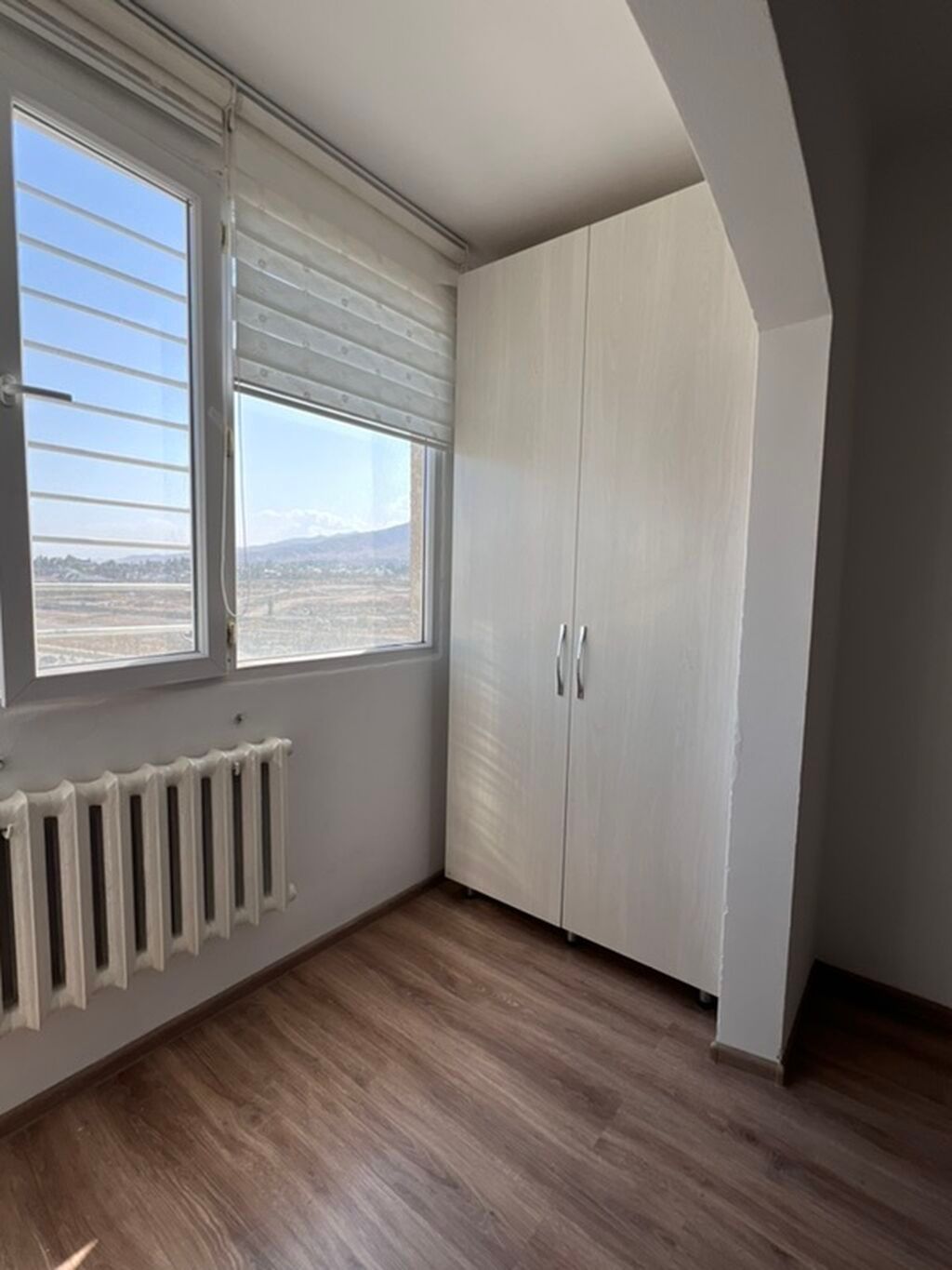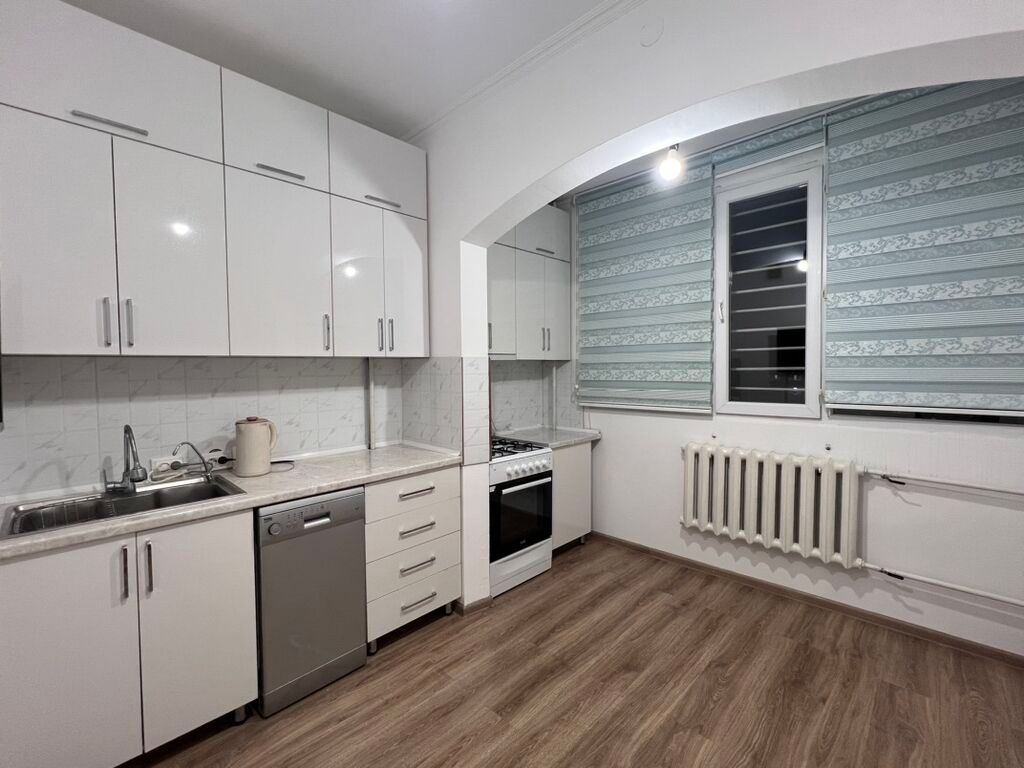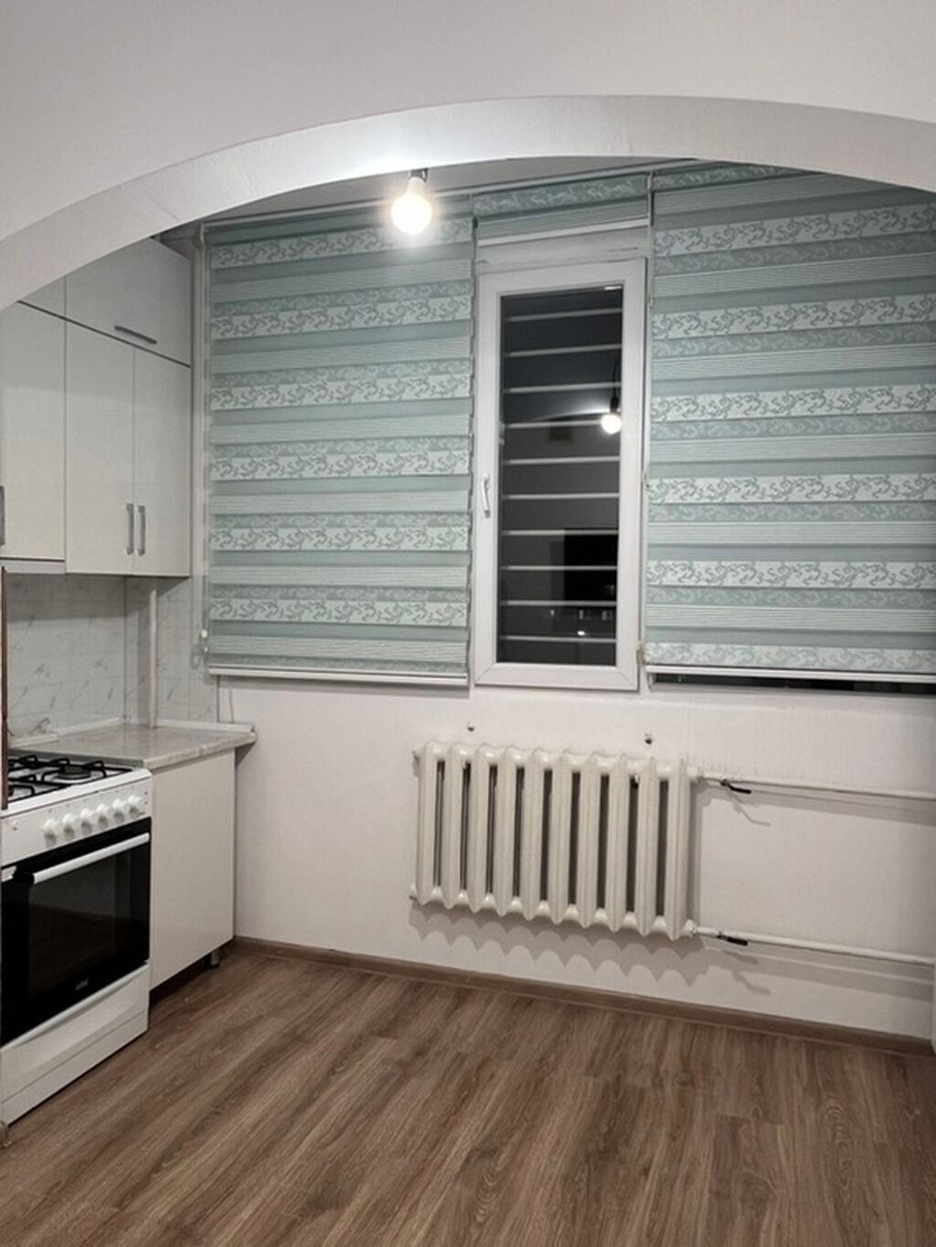 - Окна: большие, с жалюзи/рулонными шторами; на окнах установлены защитные решетки. Радиаторы отопления в комнате, кухне...