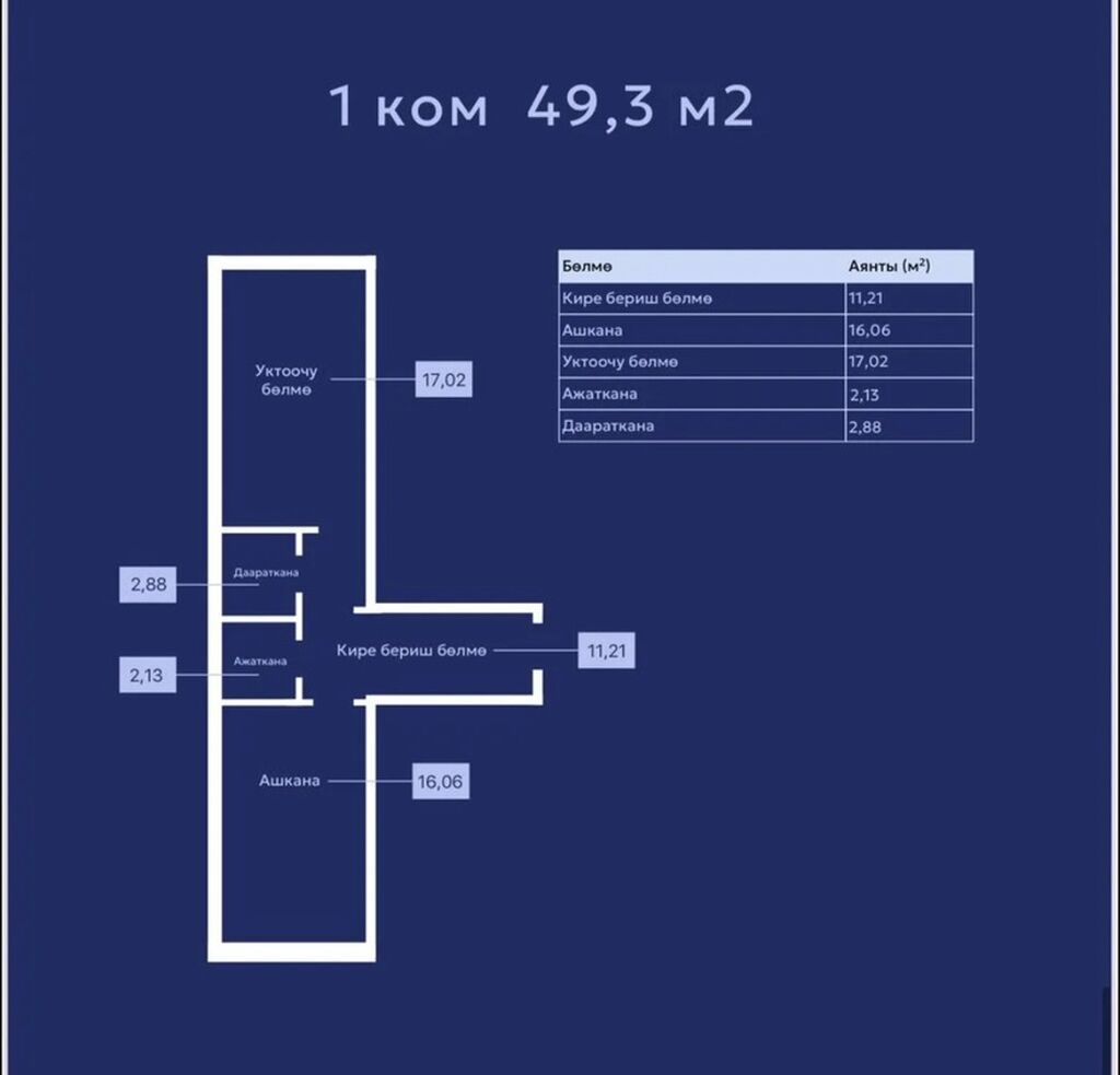 1-комнатная квартира в жилом комплексе «Тундук-1». Общая площадь — 49,3 м².