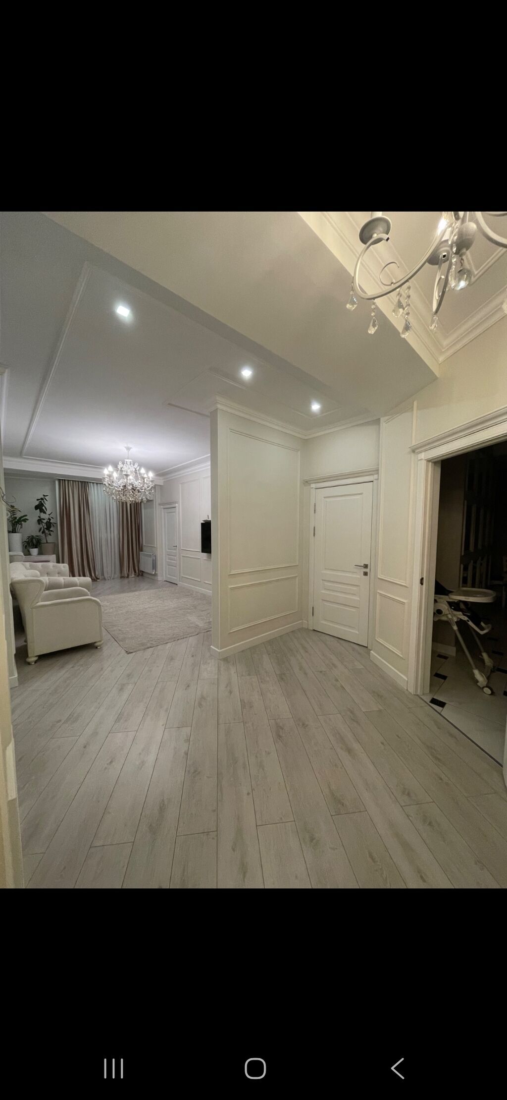 - Просторная гостиная с настенным телевизором, декоративными молдингами на стенах, хрустальной люстрой, большим ковром и комплектом мягкой мебели. Окна...