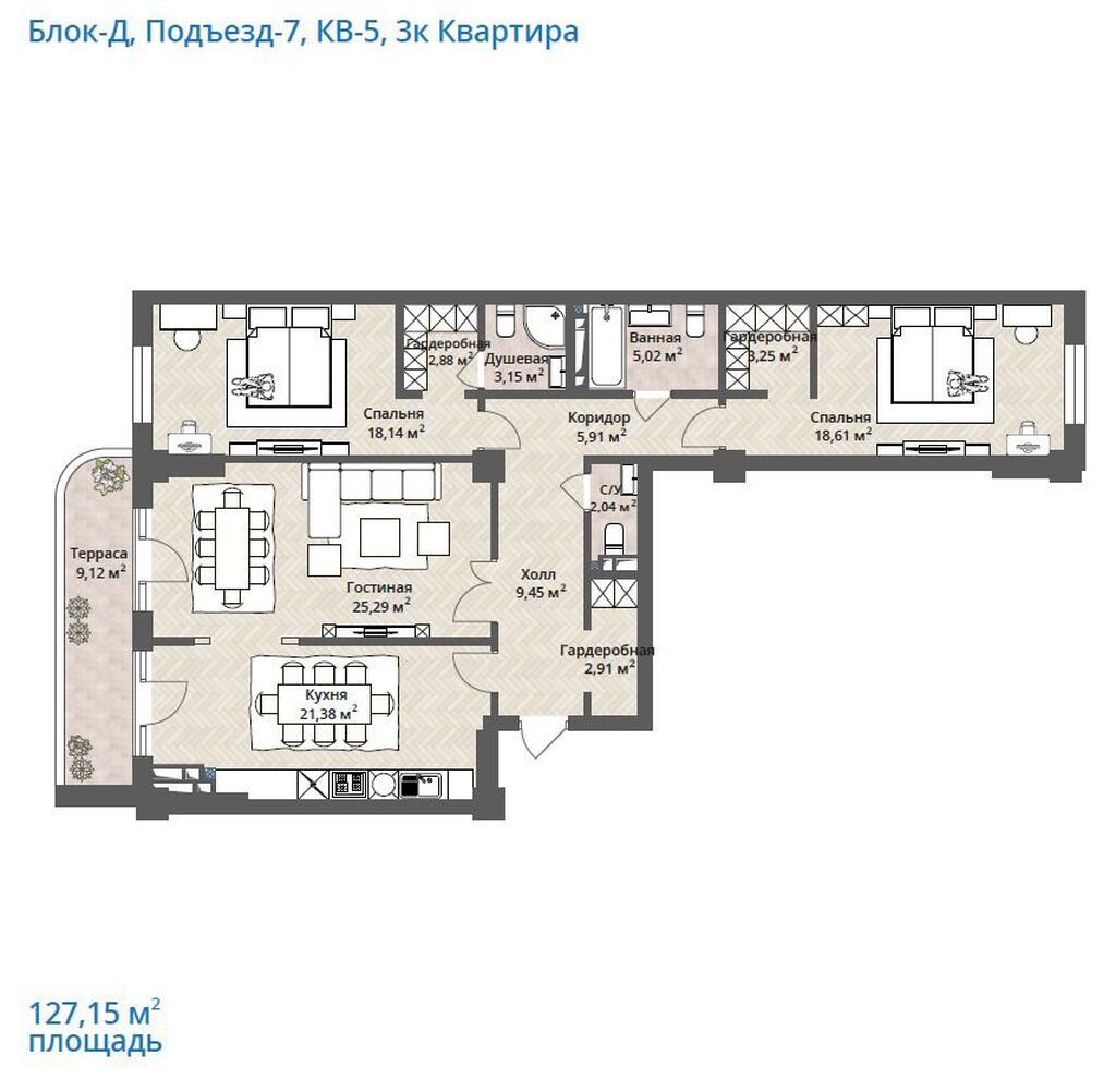 3 комнаты, 127 м², 8 этаж, Готовая ПСО (под самоотделку)